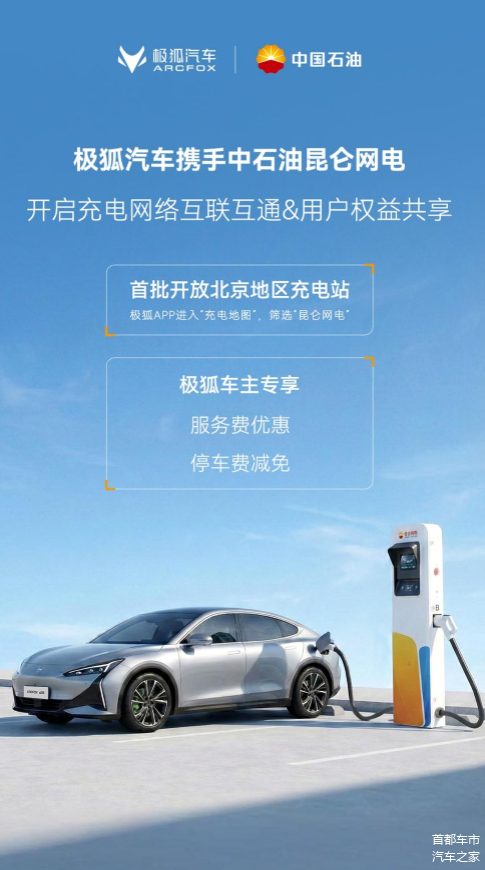 这一次,北汽极狐的“充电朋友圈”再次扩容——与中石油昆仑网联电能科技有限公司(以下简称“昆仑网电”)正式达成充电网络服务合作,首批率先在北京落地,开放15家充电站、400+个充电桩。两大“国家队”牵手,不仅打通了双方的充电网络,还带来了停车减免、服务费优惠等实打实的福利,纯电出行“说走就走”变得更有底气。