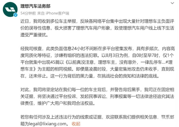 例如理想汽车去年8月份,遭遇大规模关于“车主素质差”等集体舆情,很明显就是受到了竞争对手有组织、有规划的“水军攻击”。