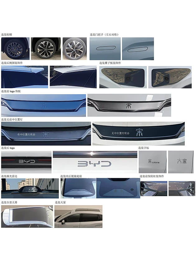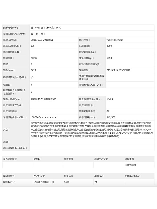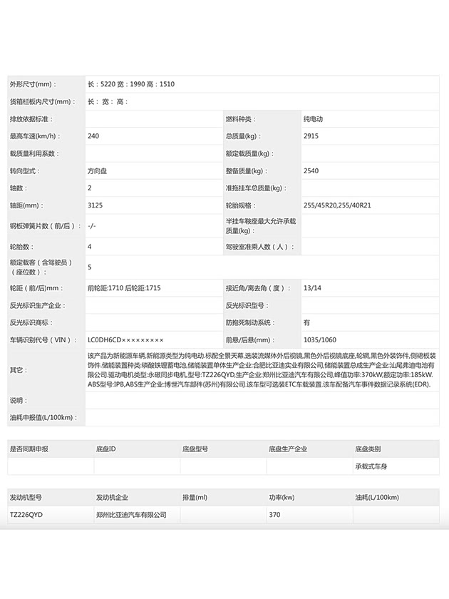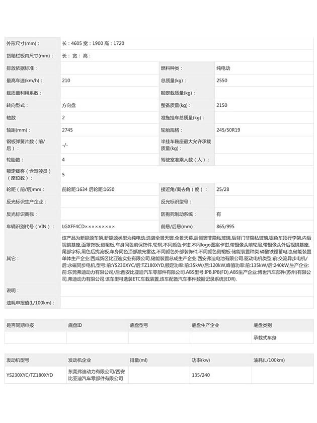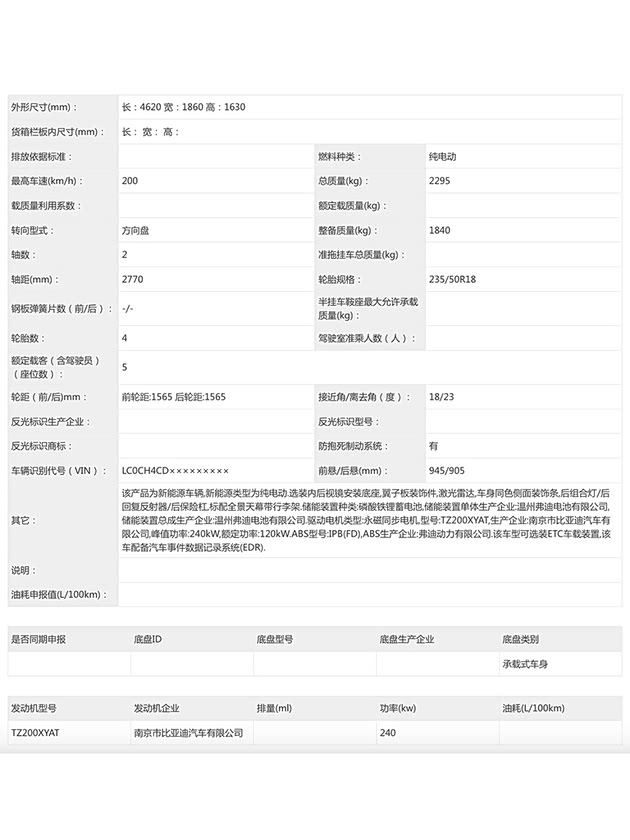 接下来是比亚迪系列的新车型,比亚迪 宋Ultra申报,新车是纯电车型,长宽高分别为4850/1910/1670mm,轴距为2840mm。外观类似于宋L DM-i,尺寸比宋L DM-i大70cm。动力采用单电机,最大功率270千瓦。