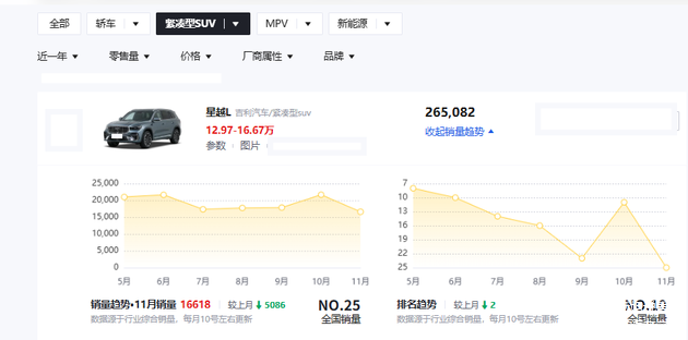 而在销量方面,车子强势蝉联燃油SUV年度头部,2025年狂卖26.9万辆,自上市以来,全球销量突破了90.5万辆,销量很火!从终端零售销量上看,吉利星越L 2025年1-10月累计销量达238916辆,近一年卖出265082辆,在紧凑型SUV中销量地位很有分量!要知道在新能源渗透率持续走高的背景下,能有这样的销量表现,可以说车子的产品力很扎实。