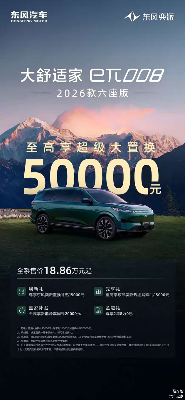 随着2026年汽车“两新”政策精准落地,新能源汽车市场迎来新一轮消费热潮。央企东风汽车旗下奕派科技,第一时间响应国家提振汽车消费号召,为广大车主送上开年购车大礼——东风奕派eπ008全系至高享50000元价值权益,限时福利错过再等一年!