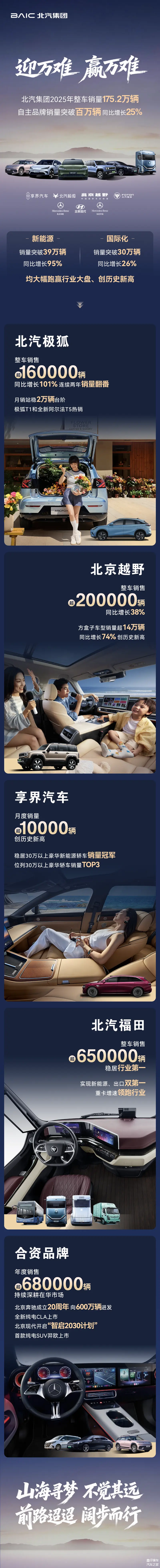 北京现代提出“智启2030计划”,其核心并非简单的产品更新,而是围绕智能座舱、电动化平台和本土化开发节奏进行调整。从用户角度来看,合资品牌智能化能力的提升,有助于缩小与自主品牌在智能体验层面的差距,为偏好合资体系的消费者提供更多选择空间。综合2025年销量数据可以看到,北汽的优势并不集中在单一爆款,而是通过自主、新能源、越野、商用车和合资多板块形成互补。这种结构使集团在市场波动时具备更强的调节能力。对消费者而言,选择这样的体系品牌,往往意味着更长的产品线延续周期与更完整的服务网络。
