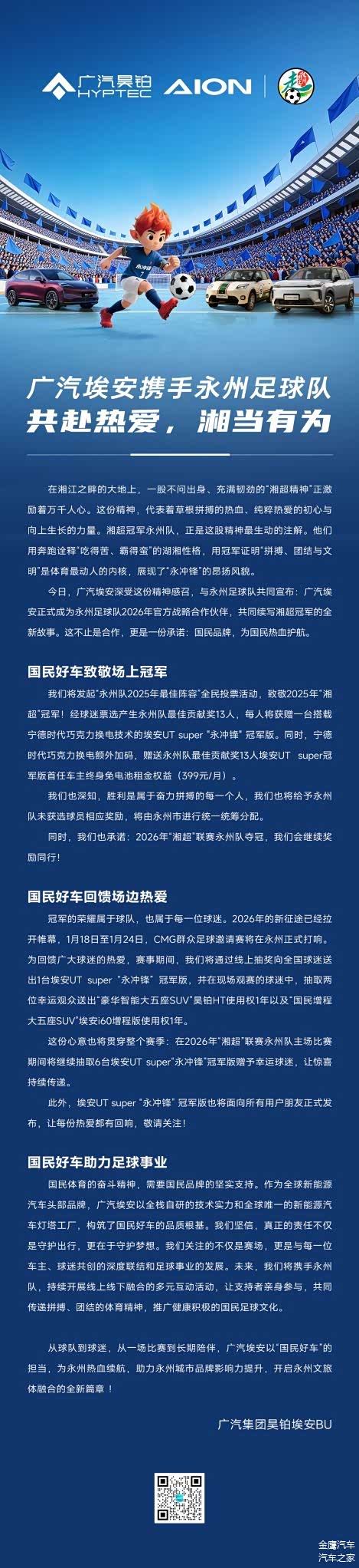 从“为国民造好车”到“与国民共热爱”,广汽埃安与永州足球队的战略牵手,是对拼搏精神的致敬,更是将体育精神转化为推动城市活力、赋能美好生活的具体实践。双方将以2026赛季为新起点,在“品牌+体育+文旅”的融合探索中,持续释放国民品牌与城市精神共振的深层价值,为湖南体育事业与区域发展注入可持续的向上能量。