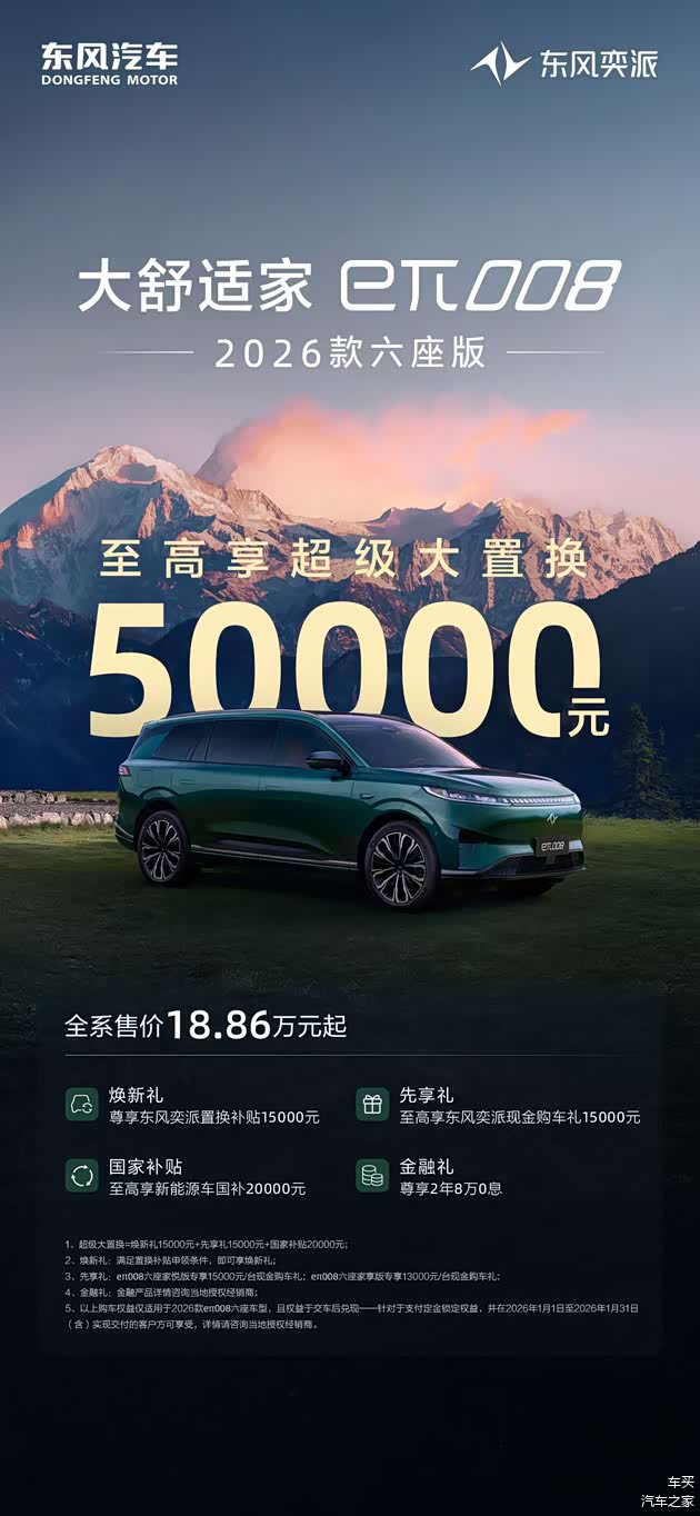 同样3025mm越级轴距,东风奕派eπ008五座版和六座版究竟怎么选?答案来了!2026开年之际,这款15-20万级新能源中大型SUV爆款车型,携至高50000元价值权益重磅登场,双版本各有亮点,满足不同家庭需求。