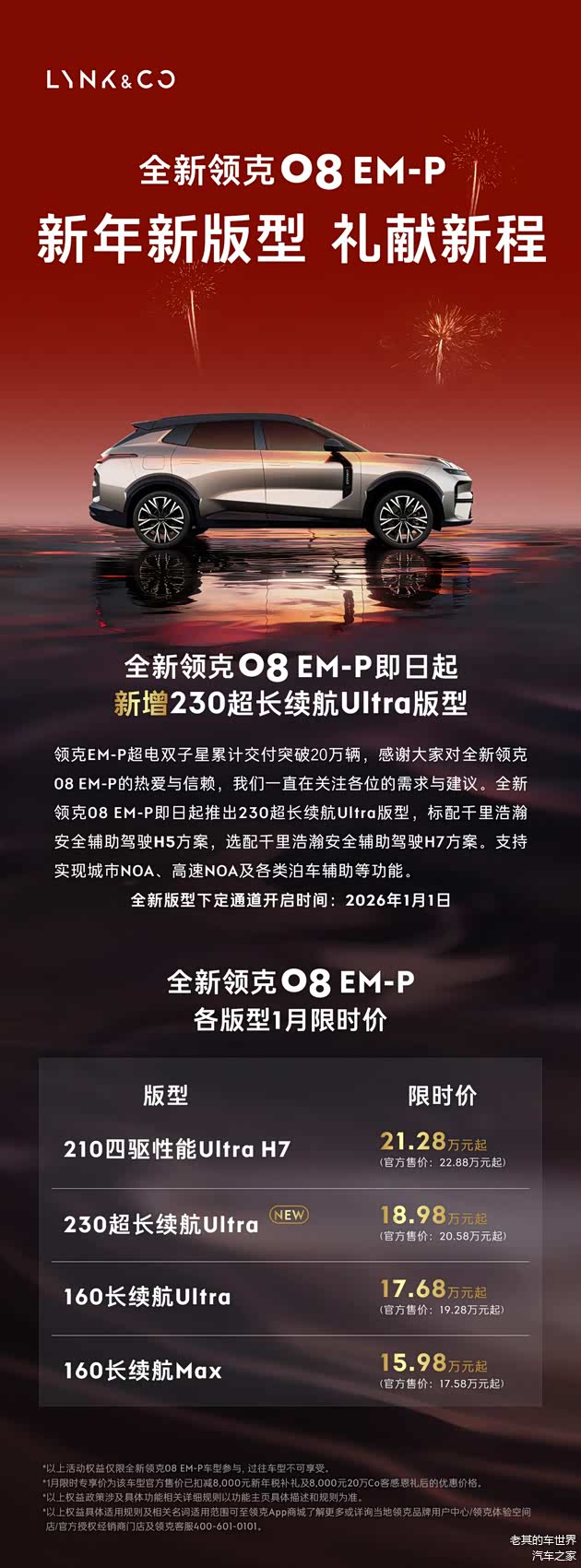 当下审视新能源SUV时,许多购车者的心理已发生转变,一个普遍体会是:数据对比令人愈发困惑,而真正关乎日常出行,却更多思量“能否更简单省事”。特别是家庭用车群体,场景通常涵盖上班通勤、接送孩子、周末游玩乃至跨省自驾,倘若一辆车总需要在补能安排与配置权衡间不断妥协,很快便会消磨掉用户的耐心。正是在这一普遍诉求下,全新领克08EM-P渐渐从“关注对象”转变为不少家庭用户的常驻备选清单。随着230超长续航Ultra版型在2026年1月如期上市,这款车型在续航能力、功能配备与售价之间的协调性,也变得愈加鲜明。