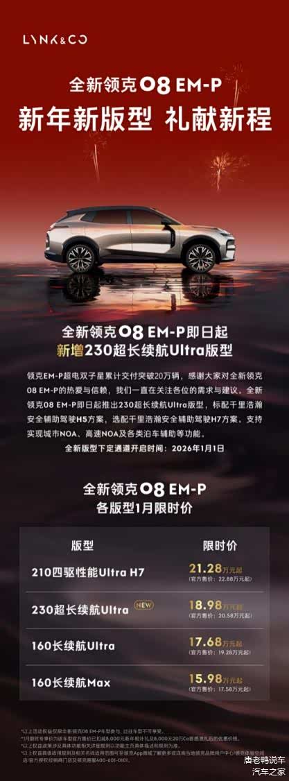 现在20万级插电混动SUV赛道,“续航不够用”“配置有取舍”仍是不少消费者的购车顾虑。尤其对于多场景用车的家庭群体,既想兼顾日常通勤的低成本,又要保障长途出行的从容,还要配齐舒适与辅助功能,这样的需求往往难以兼顾。全新领克08 EM-P精准洞察这一市场痛点,于2026年1月推出230超长续航Ultra版,不仅补全了产品矩阵的续航缺口,更以“无短板”的产品力,在同质化竞争中走出了差异化路线。