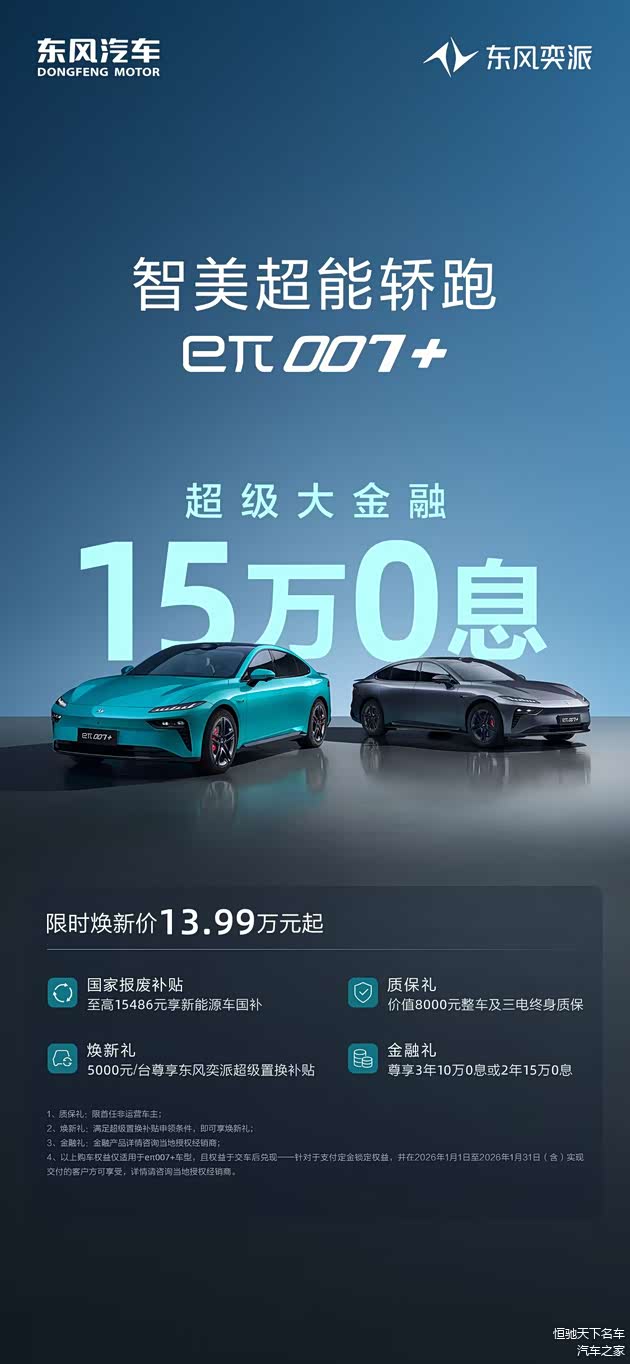 2026开年购车福利重磅来袭!东风奕派eπ007+携“15万0息”金融大礼强势登场,以低门槛、高性价比优势,成为年轻人入手新能源轿跑的首选,让每一位追光青年都能轻松圆轿跑梦,无压力拥抱高品质出行。