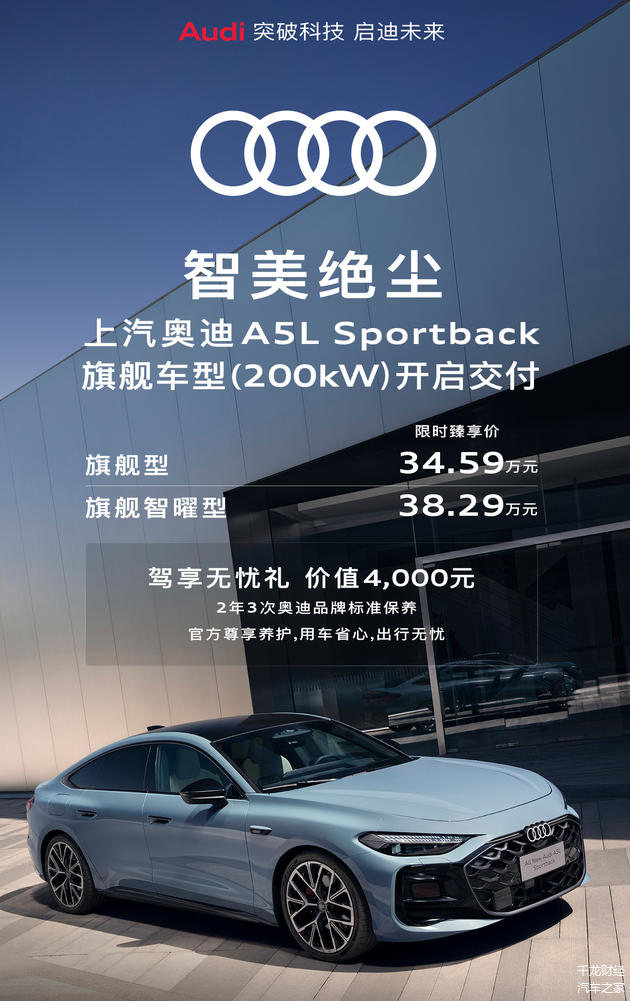 本次交付的上汽 奥迪A5L Sportback旗舰车型共推出两款配置,其中“旗舰型”限时臻享价34.59万元,“旗舰智曜型”限时臻享价38.29万元。为回应用户期待,购车即可尊享价值4,000元的“驾享无忧礼”,包含2年3次奥迪品牌标准保养服务,以体系化专业养护保障用车全程品质。