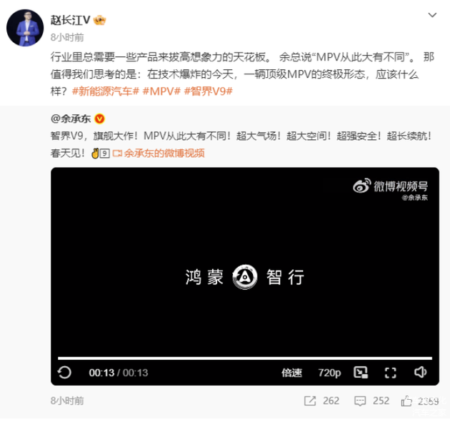 2026年1月9日,前腾势品牌总经理赵长江在转发余承东 智界V9预热微博时,高调为这位新东家的产品代言。