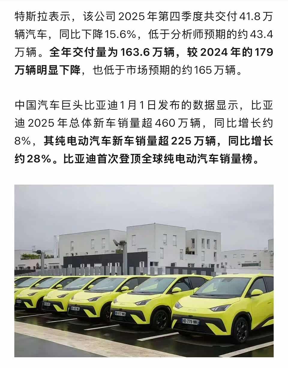 昨天特斯拉公布了去年第四季度交付量为418227辆,同比下降16%,在全球电动车制造商排名中明显被甩在中国比亚迪身后。特斯拉发声明说,这个销量不仅低于分析师预期,也未达到公司自身目标!但相比之下,比亚迪无论是季度还是全年,纯电动车销量都实现增长,全年交付接近226万辆,而特斯拉为164万辆。