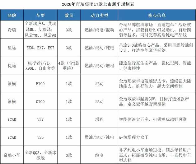 这份计划包含清晰的产品规划:奇瑞燃油系列3款新车、风云系列3-5款新品,星途、捷途、纵横、iCAR等品牌均有重点车型推出,其中iCAR V27瞄准方盒子车型热潮;技术方面,聚焦智能化升级、混动技术领先、座舱体验优化、全固态电池装车,持续夯实技术竞争力;品牌布局上,奇瑞主品牌坚持“价值”定位,星途向上突破,捷途深耕旅行生态,纵横定位豪华越野,iCAR聚焦年轻群体,五大品牌协同覆盖主流细分市场。
