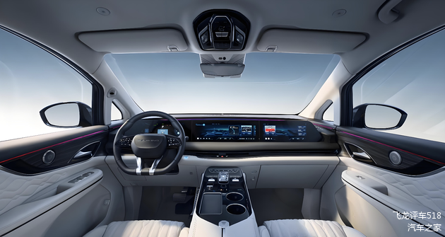 智界V9的环抱式的座舱合了东方色彩美学,车顶采用了分段式的全景天幕,带来了更好的采光。中控台和门板四周还加入了实木装饰面板,搭配着银质金属材质、亮黑色钢琴烤漆装饰面板,层次感丰富,还加入了与车漆色一致的安全带、超纤绒材质的顶棚和地毯、数字投影灯和氛围灯,凡是手能触及到的区域都是柔软、细腻的高级质感。中控台配备了大尺寸的全液晶仪表、大尺寸中控屏以及副驾驶多媒体大屏组成的带鱼屏设计,还提供了后排多媒体吸顶屏,科技感十足。