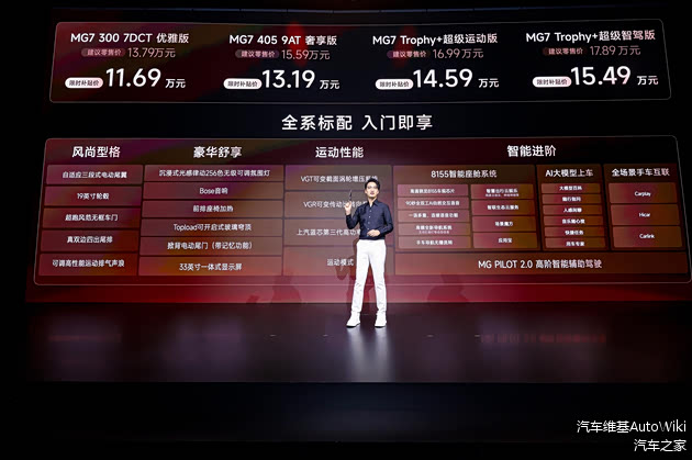 1 月 6 日,MG 旗舰轿跑 MG7 2026 款正式上市,带来 4 款车型选择,限时补贴价仅 11.69 万元 - 15.49 万元。这款承载着 MG 品牌百年赛道基因与技术积淀的新车,以 “全系标配” 为核心主张,将过往仅存于高端轿跑的豪华配置与驾控技术全面下放,不仅完成了产品自身的迭代升级,更以 “技术平权” 的实践重新定义了 15 万级轿跑的价值天花板。