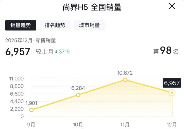 去年12月份也就2025年12月份尚界H5销量出现了明显的下滑,直接从11月份的一万多辆下滑到了不足7000辆,所以那15万的订单到底去哪了,那里面的水分到底有多大!