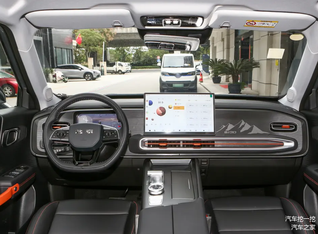 来到内饰,BJ30高低配版本只相差1万,所以我觉得直接上四驱版本就好,毕竟越野属性更强一些。比如四驱版本就有涉水感应系统、这个就是路虎的全路况反馈模式,想要越野这个配置必须要有。而且轮毂从18英寸升级到19英寸,前排也升级座椅通风加热,以及一套电控四驱系统。但它的车机大屏只支持安卓互联,不过也有15.6英寸,也是搭载高通骁龙8155芯片,APP和功能性都比较丰富。可以看到整个中控布局很简单,取消实体按键,仅保留电子档把和模式选择,内饰也采用电车的思路风格。不过细节上设计也很越野,比如扶手这些方方正正的设计就很像奔驰大G的感觉,可惜内饰塑料材质比较多一些,但起码视觉上显得豪华很多,比丰田内饰有档次感许多。