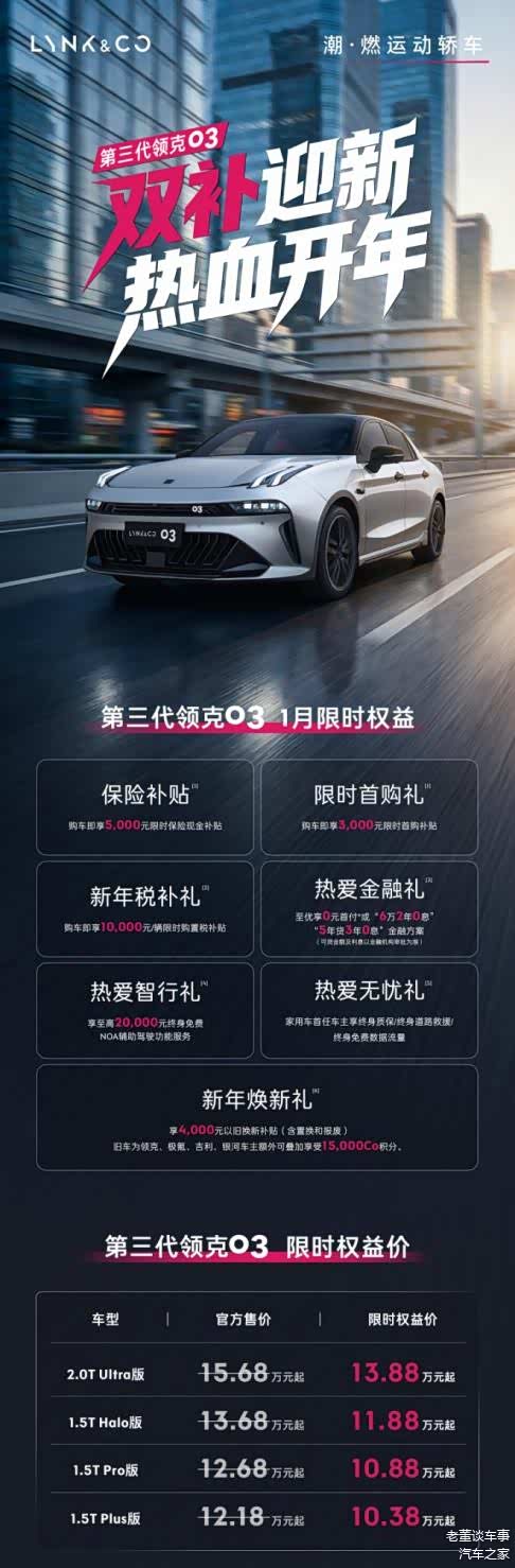 刚步入社会的年轻人,想过年开新车却面临预算压力:全款购车压力大,贷款又怕利息过高,福利政策也多偏向高端车型。他们需要的是一台符合年轻审美、使用靠谱,且购车成本可控的车,让过年返乡不用再抢票挤车。领克03性能家族推出的1月限时购车权益,正好适配这份需求,多重福利有效降低购车成本,1月底前提车刚好赶上春节,让预算有限的年轻人也能轻松实现“过年开新车”的愿望。