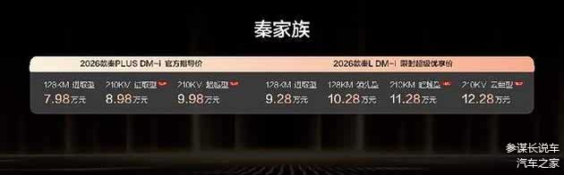 1月8日,比亚迪秦家族迎来重磅加推,2026款秦L DM-i /2026款秦PLUS DM-i 210KM长续航版双车同步上市,售价8.98-12.28万元。其中,2026款秦L DM-i 210KM长续航版限时超级优享价11.28-12.28万元,