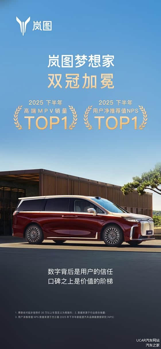 1月10日数据显示, 岚图梦想家在2025年下半年销量为43191台,再次蝉联高端MPV第一,2025全年达到80248台,同比增长46%。另据杰兰路发布的《2025年度下半年新能源汽车品牌健康度研究(NPS篇)》,岚图梦想家在2025年下半年以78.5分的净推荐值(NPS)位居新能源MPV榜首。