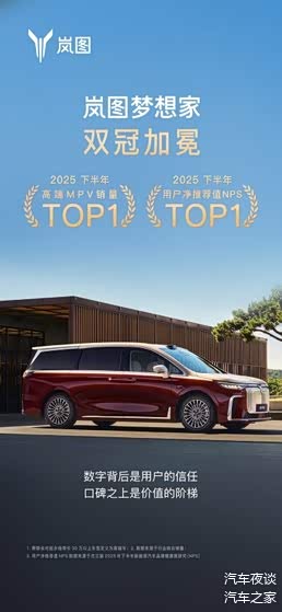 双冠的背后,是两种截然不同的胜利:销量第一,是产品在广阔市场中经受住严苛检验的证明,意味着岚图梦想家已通过市场检验,成为消费者用真金白银投票的成熟产品;NPS第一,则意味着岚图梦想家成为用户心中最值得推荐的新能源MPV,形成了口碑效应与圈层认同,在用户心智中构筑了难以撼动的信任与偏好。两者合一,标志着岚图梦想家完成了从“被选择”到“被推崇”的质变。凭借这双重权威认证,岚图梦想家正在重新系统性定义高端MPV的价值体系和价值标尺。