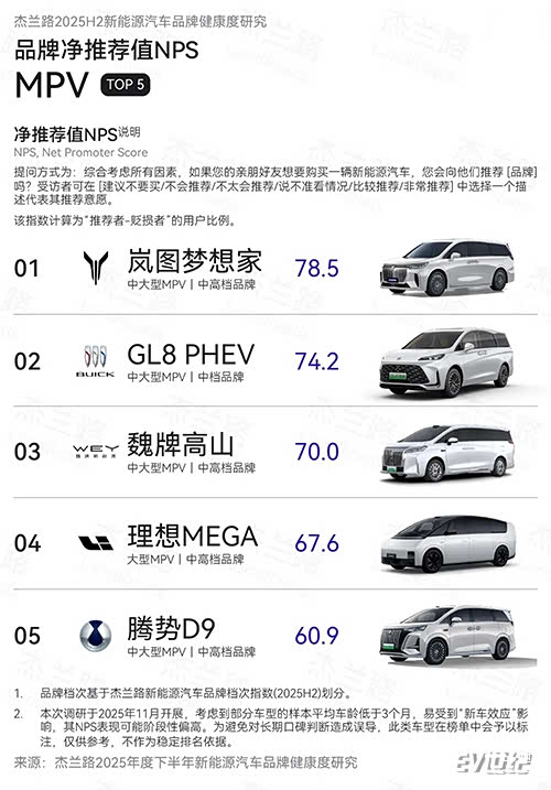 1月10日数据显示,岚图梦想家在2025年下半年销量为43191台,再次蝉联高端MPV第一,2025全年达到80248台,同比增长46%。另据杰兰路发布的《2025年度下半年新能源汽车品牌健康度研究(NPS篇)》,岚图梦想家在2025年下半年以78.5分的净推荐值(NPS)位居新能源MPV榜首。作为豪华旗舰MPV,岚图梦想家在2024年、2025年连续蝉联MPV用户净推荐值第一,成为销量与口碑的“双料冠军”,持续引领中国高端MPV。