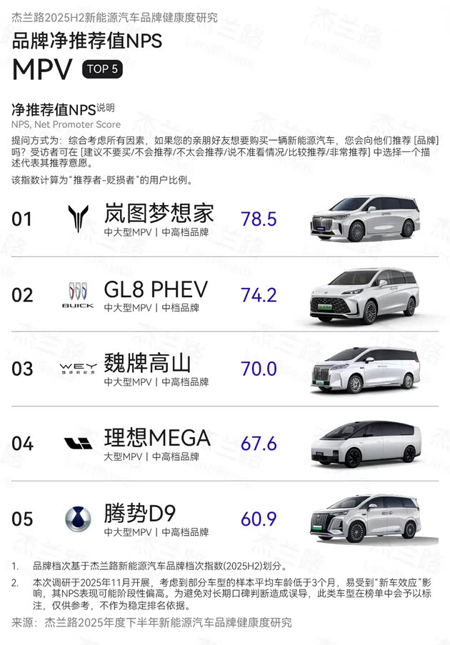 最新数据显示, 岚图梦想家在2025年下半年销售43191台,继续位居高端MPV市场首位,全年累计销量达80248台,同比增长46%。同期,在杰兰路发布的《2025年度下半年新能源汽车品牌健康度研究(NPS篇)》中,该车型以78.5的净推荐值位列新能源MPV榜首。这已是其连续两年在MPV用户净推荐值排名中居首。