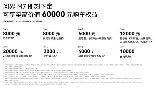 为了让更多家庭体验到这辆全能SUV的魅力,问界近期推出了力度空前的购车权益。即日起至2026年2月2日,订购全新问界M7可享至高60000元的购车优惠,老车主还可额外专享最高10000元的车款减免。这不仅是价格的让步,更是品牌诚意的直接体现。