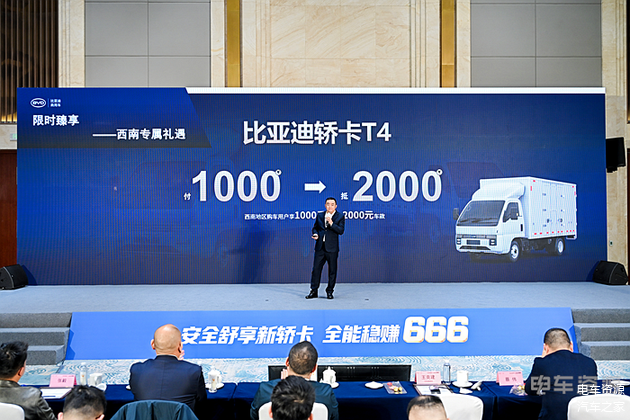 1月9日,由比亚迪商用车与电车资源联合主办的“安全舒享新轿卡 全能稳赚666”——比亚迪轿卡T4品鉴会重庆站圆满举行。比亚迪轿卡T4凭借“6重高效、6维安全、6感座舱”全能产品力,重新定义新能源小卡创富新标杆,现场签约拿下390台车订单。