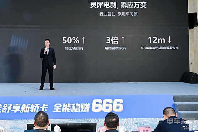 6维安全更安心。行业首创灵犀电刹灵犀电刹标配车身稳定系统(ESC)、牵引力控制系统(TCS)、紧急制动辅助(HBA)、坡道辅助(HHC)、动态驻车(CDP)等多项安全辅助功能,实现毫秒级制动响应,制动力和响应速度较传统制动分别提升50%和3倍,80km/h满载制动距离较传统制动缩短12米。标配全车盘式制动,且100%SOC仍可电制动辅助,长下坡刹得住刹得稳。