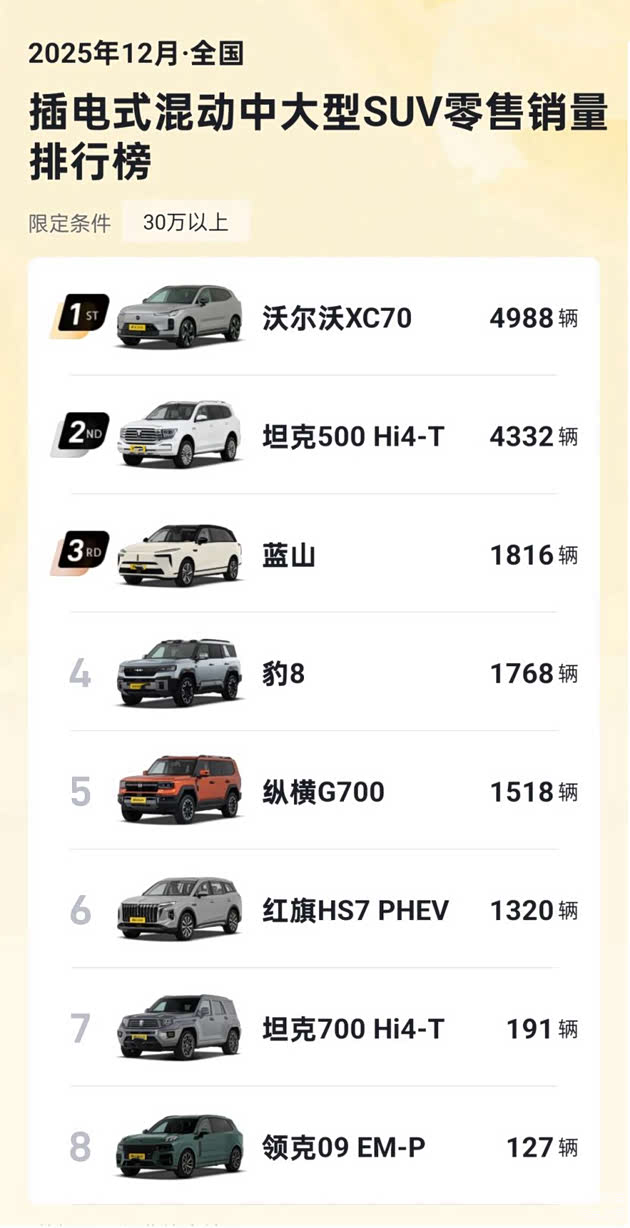 大家都知道,在30万级豪华SUV市场中, 奥迪Q5L长期占据着重要地位,其品牌认知度和均衡表现吸引了不少消费者,然而,随着沃尔沃全新XC70携“超级混动”技术的登场,市场格局可以说悄然发生了变化——全新XC70不仅12月单月销量达4988台,蝉联品牌销冠,更已获得超过1.4万位车主的真实认可。