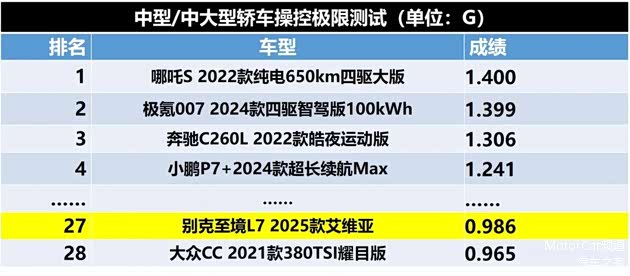 如果就有效操控极限来说,至境L7的这个0.986G,在市场上其实算是很高的。