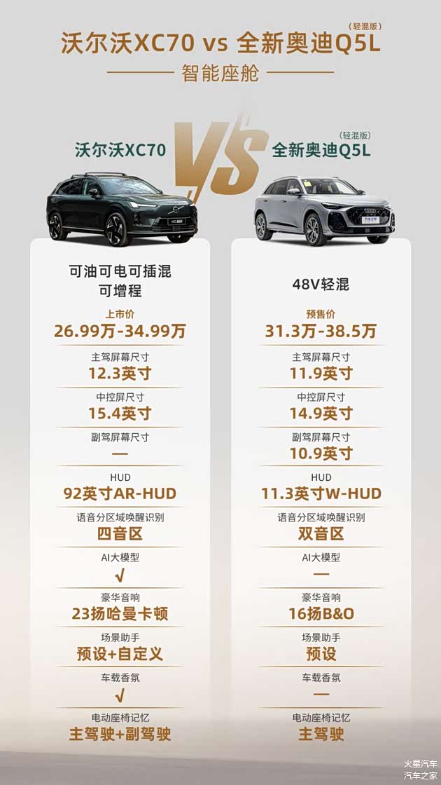 从价格上其实就能看出,沃尔沃一如既往比奥迪有诚意,不但裸车价格便宜,而且权益也很到位,叠加购置税减免与厂家补贴,相比全新Q5L需要大约3万购置税,全新XC70高配落地预算在奥迪这里只能看全新Q5L低配。当然价格只是一方面,最终还得看产品呈现,谁更有诚意呢?