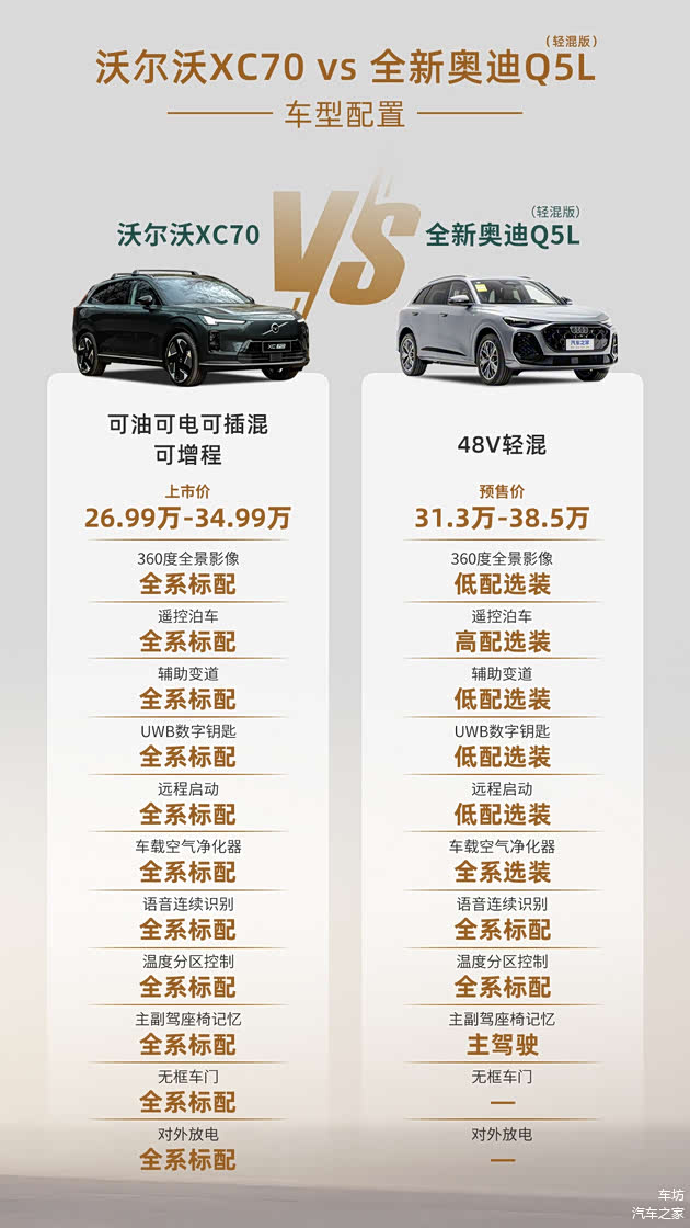 全新奥迪Q5L的内饰设计延续了全新的家族化风格,配备11.9英寸液晶仪表屏和14.5英寸中控触摸显示屏,副驾驶前方还增加了一块10.9英寸娱乐屏,并支持选装13.1英寸HUD抬头显示系统,支持前排语音识别控制、手机远程控制等,而全新XC70则是全系都有。整体来看,双方配置各有所长,全新Q5L选装较多,全新XC70标配项更多,配合价格更低,展现出了更大的诚意。