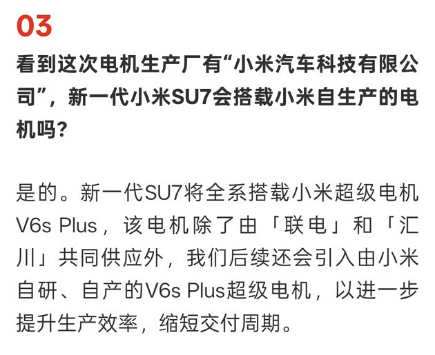 2026年1月10日,小米汽车通过官方最近发布的答网友问正式透露新一代SU7将全系搭载小米超级电机V6s Plus。