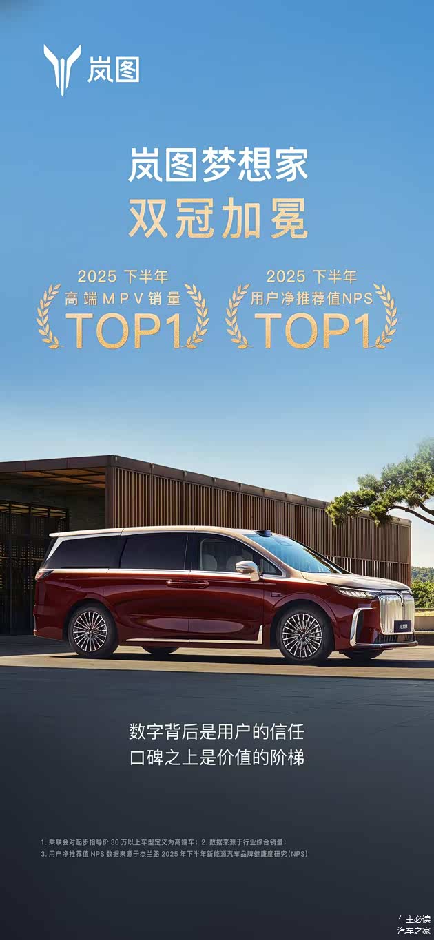 双冠的背后,是两种截然不同的胜利:销量第一,是产品在广阔市场中经受住严苛检验的证明,意味着岚图梦想家已通过市场检验,成为消费者用真金白银投票的成熟产品;NPS第一,则意味着岚图梦想家成为用户心中最值得推荐的新能源MPV,形成了口碑效应与圈层认同,在用户心智中构筑了难以撼动的信任与偏好。两者合一,标志着岚图梦想家完成了从“被选择”到“被推崇”的质变。凭借这双重权威认证,岚图梦想家正在重新系统性定义高端MPV的价值体系和价值标尺。