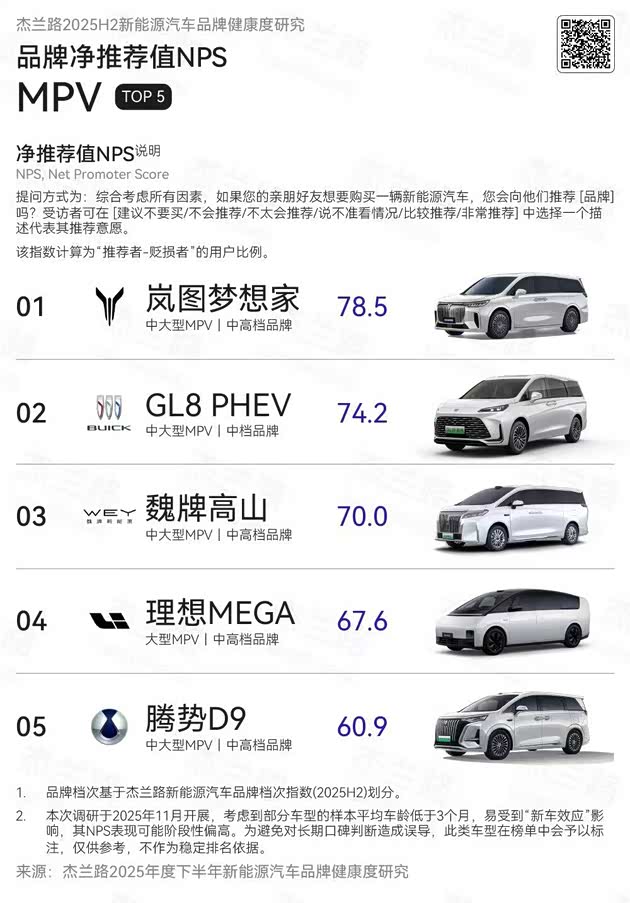 1月10日数据显示,岚图梦想家在2025年下半年销量为43191台,再次蝉联高端MPV第一,2025全年达到80248台,同比增长46%。另据杰兰路发布的《2025年度下半年新能源汽车品牌健康度研究(NPS篇)》,岚图梦想家在2025年下半年以78.5分的净推荐值(NPS)位居新能源MPV榜首。作为豪华旗舰MPV,岚图梦想家在2024年、2025年连续蝉联MPV用户净推荐值第一,成为销量与口碑的“双料冠军”,持续引领中国高端MPV。