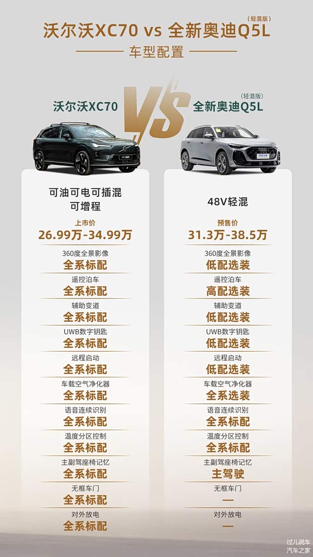 总结:能够看出,全新奥迪Q5L确实是想要通过一些改动来吸引更多年轻消费者的关注,包括价格也带来足够诚意。不过现在的年轻消费者对品牌光环并不太在意,反而是全新XC70这种“有内涵”的新能源车型更受欢迎,再者说30万预算买全新Q5L只能是低配,可选全新XC70轻松拿下高配,对比配置、动力之后更是没什么好纠结,“豪华超混第一车”实至名归!#沃尔沃XC70豪华混动销冠#