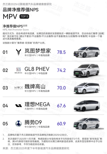 1月10日的数据显示,2025年下半年, 岚图梦想家销量达43191台,再度荣膺高端MPV销量冠军;2025全年销量更是高达80248台,同比增长46%。与此同时,杰兰路发布的《2025年度下半年新能源汽车品牌健康度研究(NPS篇)》表明,岚图梦想家在2025年下半年以78.5分的净推荐值(NPS),位居新能源MPV净推荐值榜首。作为豪华旗舰MPV,岚图梦想家在2024年、2025年连续两年斩获MPV用户净推荐值第一,成为销量与口碑的“双料冠军”,持续引领中国高端MPV市场发展。