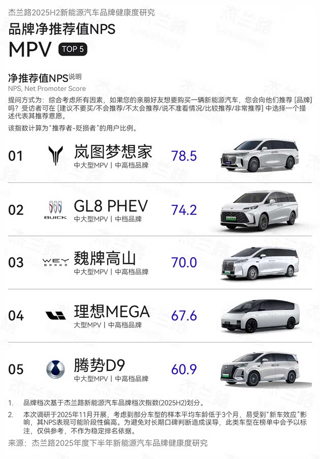 与此同时,杰兰路发布的2025年下半年新能源汽车品牌健康度研究报告中,岚图梦想家以78.5分的净推荐值(NPS)位居新能源MPV榜首,继2024年后再次蝉联该榜单第一,成为名副其实的销量与口碑“双料冠军”,持续引领中国高端MPV市场发展方向。值得关注的是,在乘联会定义的30万以上高端车范畴内,岚图梦想家均价已突破40万元,却依然能实现销量与口碑的双重领跑,在一众竞品中尽显实力。