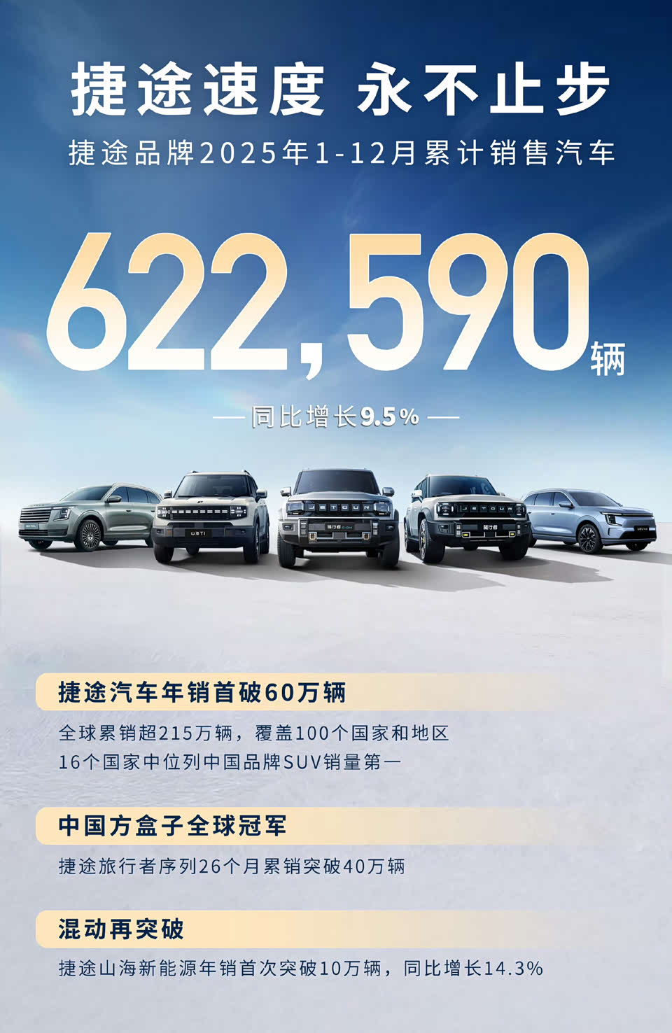 捷途2025年销量622,590辆,7年累销突破200万。新车规划:旅行者7/7L、环游者、X90L、自由者7X。
