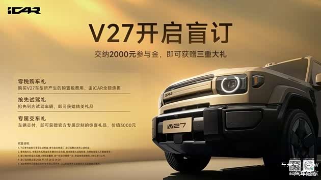 与此同时,V27开启限时盲订,即日起至2月28日,用户支付2000元参与金,即可锁定iCAR全额承担购置税的零税购车礼、抢先试驾礼,以及价值3000元的专属交车礼。