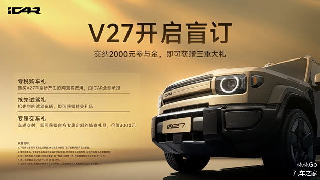 为迎接V27即将上市,iCAR同步启动了限时盲订计划。即日起至2月28日,用户支付2000元参与金,即可锁定“零税购车”权益——由iCAR全额承担车辆购置税,并可享受抢先试驾及价值3000元的专属交车礼。这一政策进一步降低了用户的购车门槛,增强了市场吸引力。