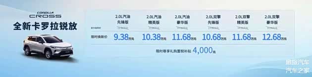 全新卡罗拉锐放,聚焦城市通勤,原官方价格区间为12.68万元-15.98万元,限时焕新价格为9.38万元-12.68万元。订车用户额外享受 4000 元购置税补贴,高品质城市SUV触手可及。
