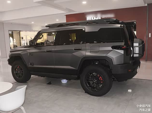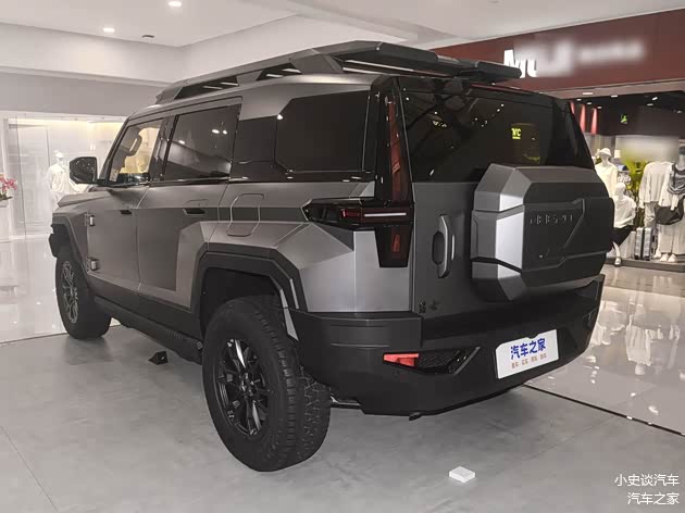 再来看车身侧面部分,猛士917采用了平直硬朗的腰线设计,搭配大尺寸厚壁轮胎,散发出机甲般的强悍风格。车身尺寸为4987/2080/1935mm,轴距达到2950mm,定位中大型SUV,确保了宽敞的内部空间。车顶线条平直,配备粗壮的行李架,增强了实用性。轮眉和侧裙部分的造型粗壮,凸显了力量感,多幅式熏黑造型的轮毂让视觉效果更显魁梧。整体设计不仅符合年轻消费者的审美,更体现了硬派越野车的实用性与美学平衡。