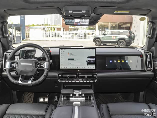 进入车内,新车的五屏交互系统是内饰核心,12.3英寸液晶仪表+15.6英寸中控屏+副驾娱乐屏+HUD+后排扶手屏,实现全场景智能控制,车机响应灵敏,支持多场景自然语音指令。空间表现亮眼,大五座布局下,身高180cm乘客在前排调整舒适坐姿后,后排仍有两拳腿部余量与充足头部空间。后备厢基础容积452L,放倒后排后扩展至1137L,可轻松容纳露营装备与户外器材。配置上,座椅支持前后排通风、加热、按摩,16个丹拿音响与车内香氛系统,将越野与豪华舒适融合。