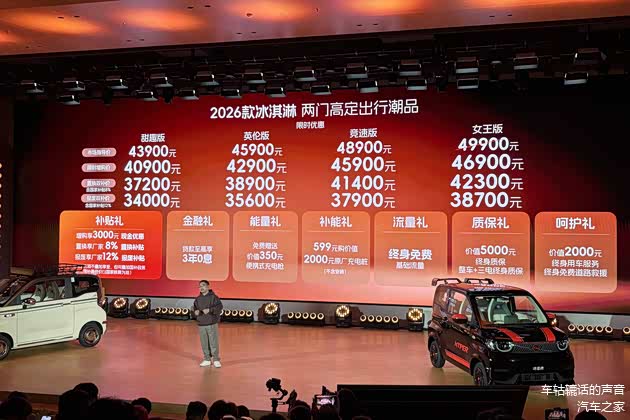 2026年1月10日,2026款奇瑞冰淇淋正式上市,新车推出甜趣版、英伦版、竞速版、女王版共4个版型,售价区间为4.39万至4.99万元。2026款奇瑞冰淇淋以设计焕新与性能精进为核心方向,外观层面提供复古格调与运动姿态双风格选择。动力系统经优化升级后,电机最大功率提升至30千瓦,CLTC工况下续航里程可达 205公里,同时新增10千瓦快充功能。此外,车辆车身安全结构得到强化,为驾乘体验筑牢安全基础。