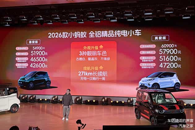 另外,奇瑞还发布了2026款全新 小蚂蚁,推出271公里喜爱版和271公里真爱版,共两款车型,市场指导价为5.49万至6.09万元,限时增购同样可享3000元优惠。作为年度改款产品,2026款奇瑞小蚂蚁在传承经典设计语言的前提下,将优化重心放在了内饰科技氛围的营造与续航能力的务实升级上。最终在各种补贴价格的加持下,新车对消费者吸引力还是有的。
