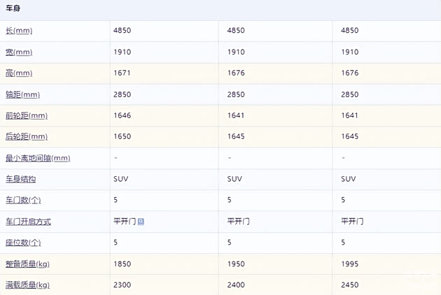 尺寸方面,长宽高4850/1910/1676mm,轴距2850mm。