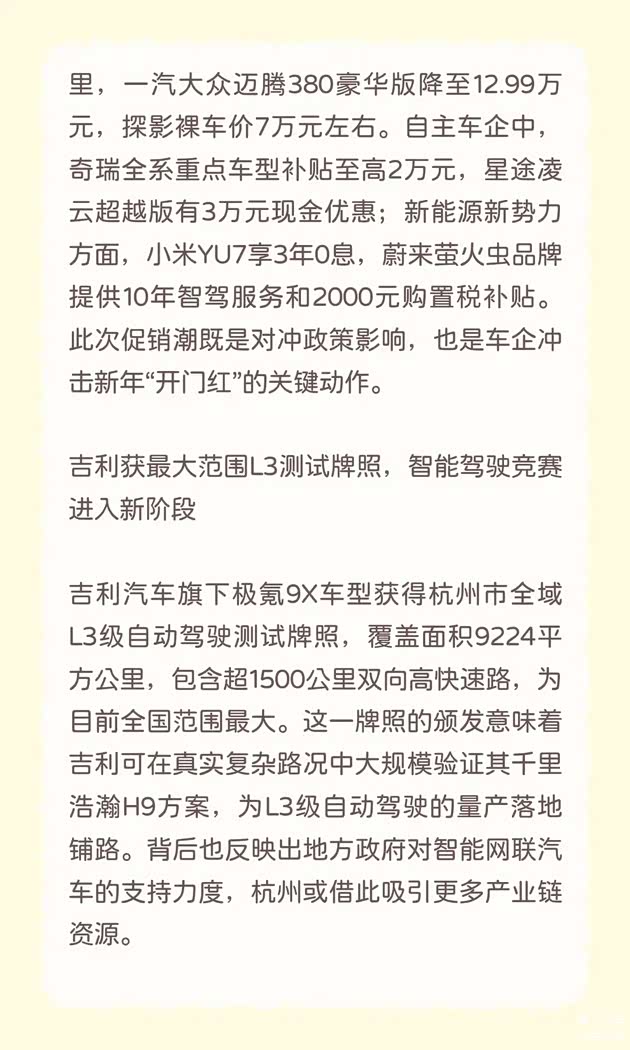 市场监测开年以来已有近20家车企推出促销政策,应对新能源购置税减半征收政策带来的购车成本增加。豪华品牌中,宝马对31款车型调价,旗舰纯电i7 M70L最高直降30.1万元,iX1降幅达24%;凯迪拉克CT5起售价22.99万元,最高优惠15万元。合资品牌里,一汽大众迈腾380豪华版降至12.99万元,探影裸车价7万元左右。自主车企中,奇瑞全系重点车型补贴至高2万元,星途凌云超越版有3万元现金优惠;新能源新势力方面,小米YU7享3年0息,蔚来萤火虫品牌提供10年智驾服务和2000元购置税补贴。此次促销潮既是对冲政策影响,也是车企冲击新年“开门红”的关键动作。