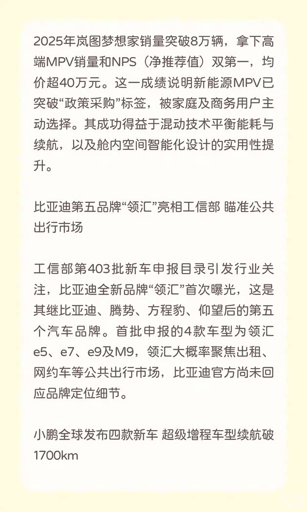 2025年岚图梦想家销量突破8万辆,拿下高端MPV销量和NPS(净推荐值)双第一,均价超40万元。这一成绩说明新能源MPV已突破“政策采购”标签,被家庭及商务用户主动选择。其成功得益于混动技术平衡能耗与续航,以及舱内空间智能化设计的实用性提升。