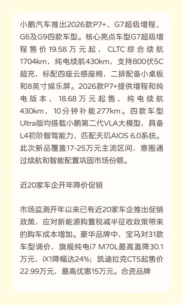 小鹏汽车推出2026款P7+、G7超级增程、G6及G9四款车型。核心亮点车型G7超级增程售价19.58万元起,CLTC综合续航1704km,纯电续航430km,支持800伏5C超充,标配四座云感座椅,二排配备小桌板和8英寸娱乐屏。2026款P7+提供增程和纯电版本,18.68万元起售,纯电续航430km,10分钟补能277km。四款车型Ultra版均搭载小鹏第二代VLA大模型,具备L4初阶智驾能力,匹配天玑AIOS 6.0系统。此次新品覆盖17-25万元主流区间,意图通过续航和智能配置巩固市场份额。